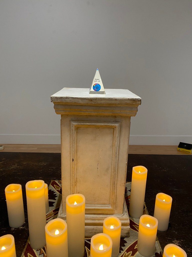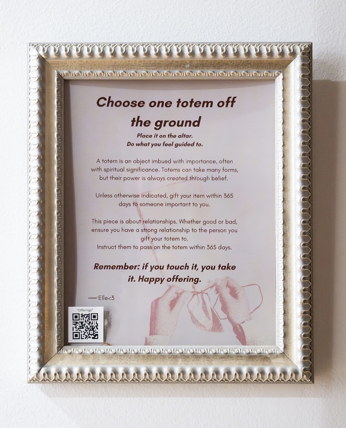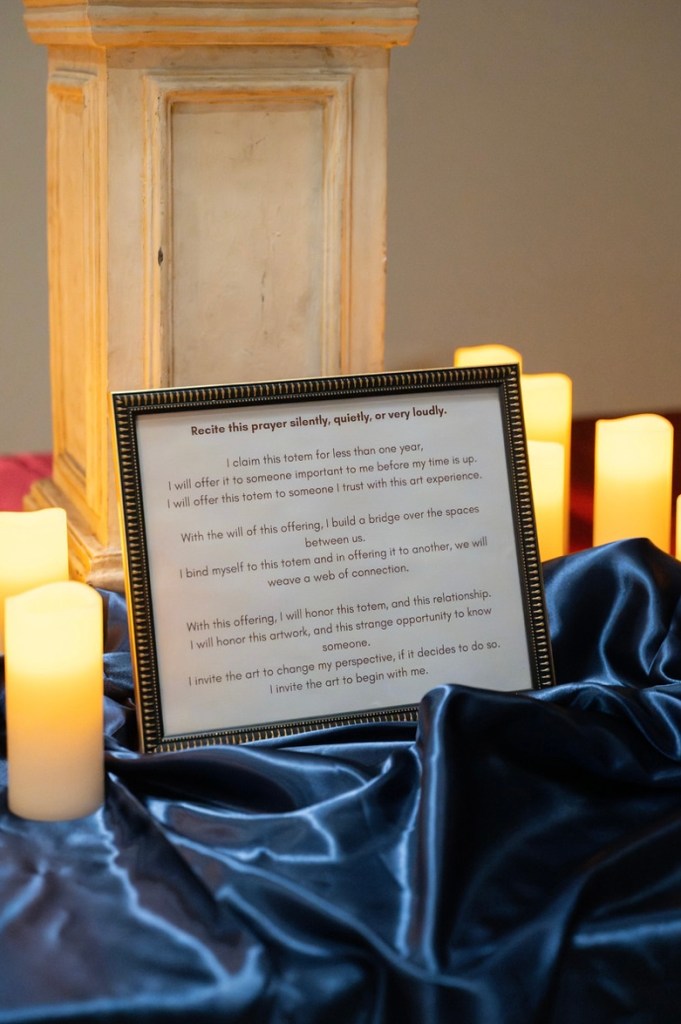 A totem is an object imbued with importance, often with spiritual significance. Totems can take many forms, but their power is always created through belief. In this relational art piece, our belief is in Art.